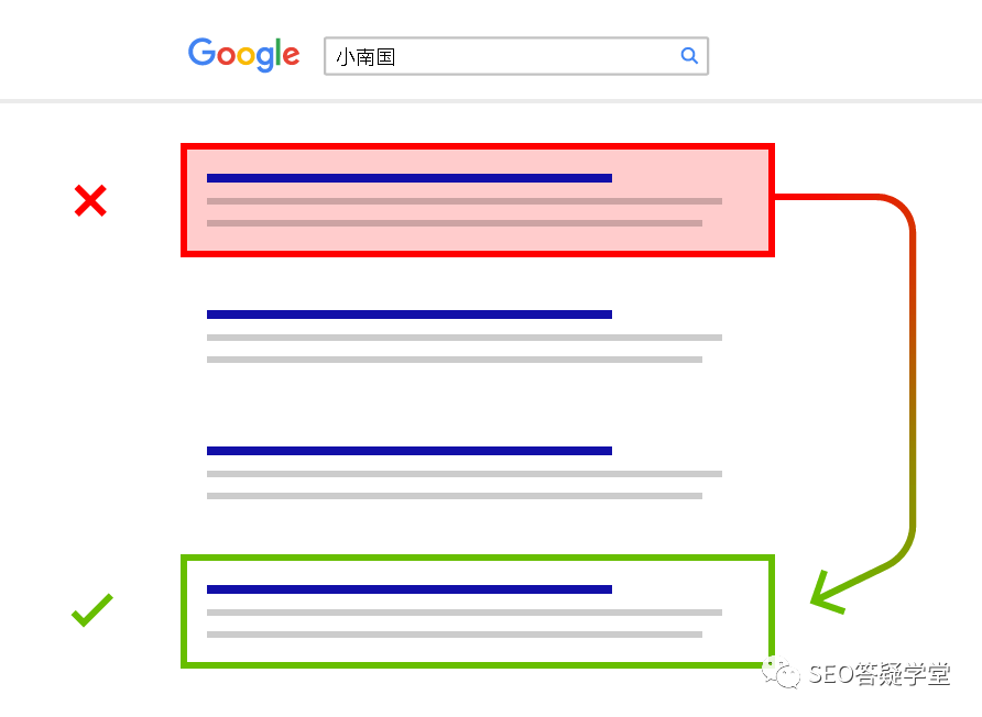 另一方面,假设我们进行相同的搜索。但这一次,你点击第1个结果后,发现该网站内容根本就没法浏览,甚至不是我们想要的内容,那么也许几秒钟后我们会从该页面返回到Google搜索结果页面继续浏览其他的搜索结果。